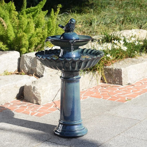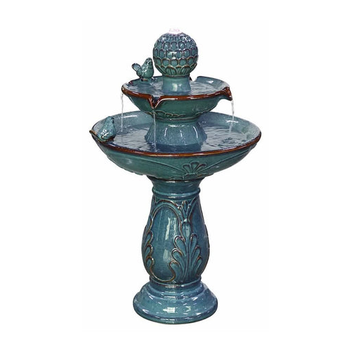 The Apollo bird bath fountain features a lovely glossy teal blue ceramic glaze. All around you'll find an elegant array of embossed floral patterns...