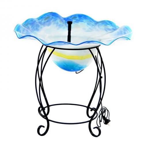 Hand Blown Glass Fountain on Wrought Iron Stand.WHAT'S INCLUDED Peacock Water Feature 240V Pump SPECS Dimensions (WxDxH): 66m x 66cm x 61cm Wei...